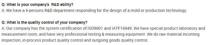 SGS, ROHS, IATF16949:2016 அல்லது வாடிக்கையாளரின் தேவைகளுக்கு மூன்றாம் தரப்பு ஆய்வு கிடைக்கும். |